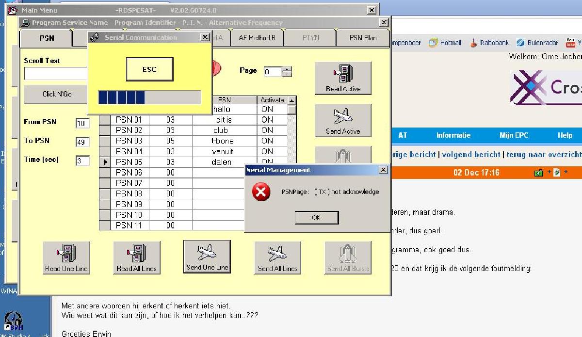| Hallo ik heb hier sinds gisteren de AEV 4500 rds liggen. Nu heb ik het volgende probleem met de coder. Ik heb al wel tekst in de coder gekregen geen enkel probleem, maar nu wou ik de tekst wat veranderen, maar drama. Als ik hem aansluit (meerdere pc's en compoorten al geprobeerd) heb ik direct verinding met de coder, dus goed. Zodra ik naar de PSN/RT ga en op "read all lines" klik leest hij ook wel direct alle regels in het programma, ook goed dus. Maar zodra ik wat verander aan de tekst, en op "send all lines" klik duurt het een een seconde of 20 en dat krijg ik de volgende foutmelding: PSNPage: ( TX )not acknowledge Met andere woorden hij erkent of herkent iets niet. Wie weet wat dit kan zijn, of hoe ik het verhelpen kan..??? Groetjes Erwin |