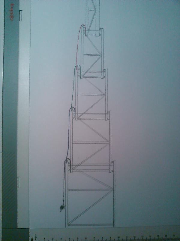 | Nog eem een vraagje over de bouw van een construciemast. Ben met een 5X6 bezig, maar ben nog aan t twijfelen over het oplieren. Heb er een schetsje van gemaakt hoe ik het nu in mijn hoofd heb, hoop dat t een beetje duidelijk is. Gaat dus een kabel van deel 1, over een katrol van 2 en zit aan drie vast. Volgende zit aan 2 vast, gaat via ene katrol op 3, en zit vast aan 4, en ga zo maar door. Is dit wat op deze manier? En hoe sterk moet de lier zijn in deze situatie, is een 1200 kilo sterk genoeg? |